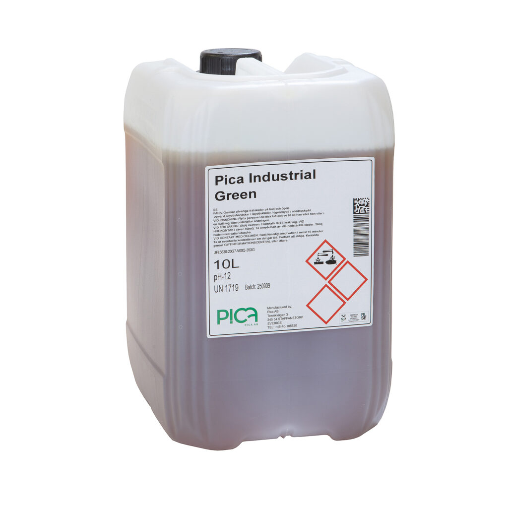 Pica Industrial är ett miljövänligt vattenbaserat alkaliskt grovrengörings–, och avfettningsmedel.